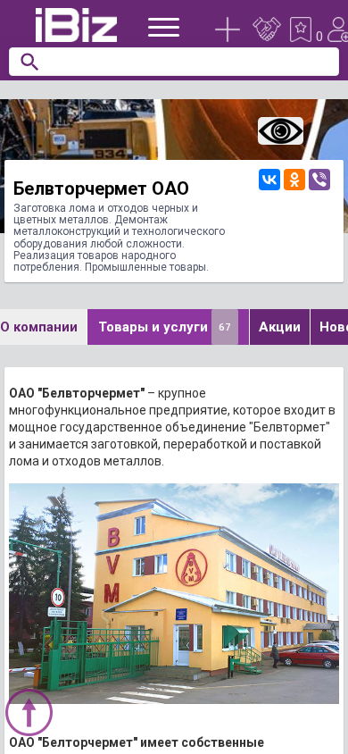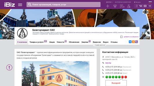 | Название / Заголовок | Белвторчермет ОАО - Заготовка лома и отходов черных и цветных металлов. Демонтаж металлоконструкций и технологического оборудования любой сложности. Реализация товаров народного потребления. Промышленные товары.. 223017, , аг. Гатово, АБК с проходной, ком. 83 |