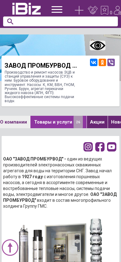 | Название / Заголовок | ЗАВОД ПРОМБУРВОД ОАО - Производство и ремонт насосов ЭЦВ и станций управления и защиты (СУЗ) к ним. Буровое оборудование и инструмент. Насосы: К, КМ, ВВН, ГНОМ, Ручеек. Бурун, агрегат перекачки жидкого навоза (АПН, ФГП). Высокоэффективные системы подачи воды.. 220024, Минск, , Асаналиева, 29 |