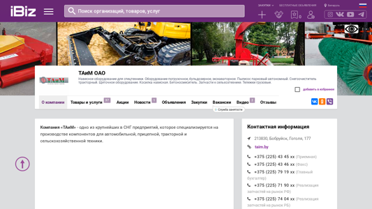| Название / Заголовок | ТАиМ ОАО - Навесное оборудование для спецтехники. Оборудование погрузочное, бульдозерное, экскаваторное. Пылесос парковый автономный. Снегоочиститель тракторный. Щеточное оборудование. Косилка навесная. Бетоносмеситель. Запчасти к сельхозтехнике. Тележки грузовые.. 213830, Бобруйск, , Гоголя, 177 |