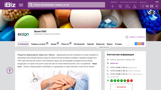| Название / Заголовок | Экзон ОАО - Производство лекарственных средств.. 225612, Дрогичин, , Ленина, 202 |