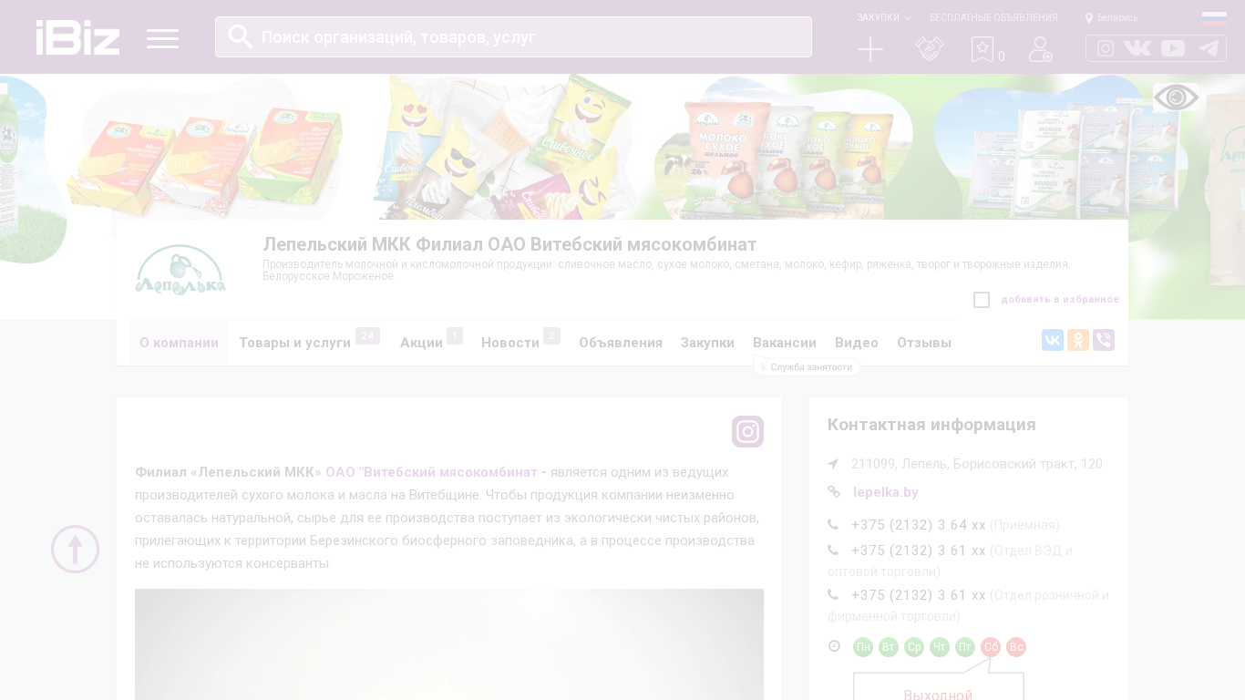 | Название / Заголовок | Лепельский МКК Филиал ОАО Витебский мясокомбинат - Производитель молочной и кисломолочной продукции: сливочное масло, сухое молоко, сметана, молоко, кефир, ряженка, творог и творожные изделия. Белорусское Мороженое. . 211099, Лепель, , Борисовский тракт, 120 |