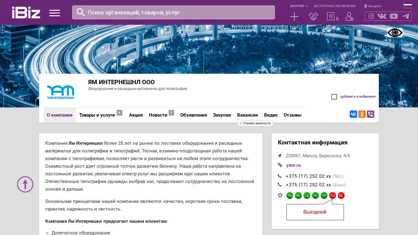 | AI-анализ | This online resource is a business-to-business e-commerce website for Yam Intereshnl OOO, a company based in Belarus that specializes in providing equipment and consumable materials for the graphic arts industry, specifically for printing and typography. The website includes a map for directions, contact information, and the address of the company located in Minsk, Bierezowa Street 4/5. The company has been operating for over 25 years in the market of supplying equipment and materials for printing and typography. The main principles of the company are quality, quick delivery, reliability, and honesty. Yam Intereshnl OOO offers various types of printing equipment, including offset printing, roll-fed offset printing, digital printing, and flexographic printing. Additionally, the company provides protective coating services. The website allows users to add the company to their favorites and includes sections for news, job listings, |
