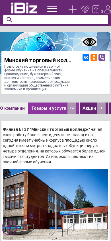 | AI-анализ | The web project "Minsk Trade College Filial of BGEU" is an educational institution in Minsk, Belarus, offering day and distance learning in various specialties including law, accounting, analysis and control, commercial activities, production of goods and organization of public catering, and economics and organization. The institution is located at Восточная 183, 220090, and provides contact information and a map for visitors. The specialties offered encompass around 1,000 square meters of teaching space, accommodating over 1,000 students, approximately 600 of whom study through distance learning. The faculty consists of 231 members, including 103 teachers, one of whom holds a doctorate. The college has been in operation for over sixty years and provides education in six main areas. The material and technical resources include three educational buildings |