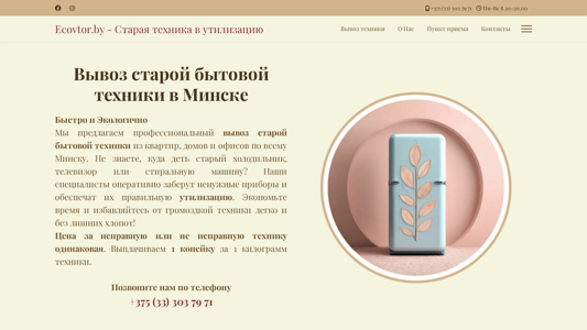 | SEO-описание | Услуга по вывозу старой бытовой техники на утилизацию. Вывозим холодильники, стиральные машины, телевизоры и другую электронику. Работаем по Минску и Минской области. |