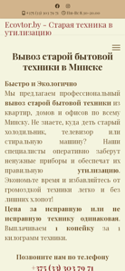 | AI-анализ | The website is dedicated to the service of removing old household appliances for recycling in Minsk and the Minsk region. The offered service includes the removal of refrigerators, washing machines, televisions and other electronics. The website provides a phone number for contact and mentions that they work in Minsk and the Minsk region. The keywords include 'technology', 'technique', 'quickly', 'time', 'without', 'already', 'removed', 'all', 'television', 'you', 'thank you'. The top words are 'technology', 'technique', 'very', 'remove', 'quickly', 'time', 'without', 'already', 'service', 'minisk', 'help', 'thank'. The website offers a professional removal of old household appliances from homes, offices and apartments in Minsk. They accept any type of appliance |