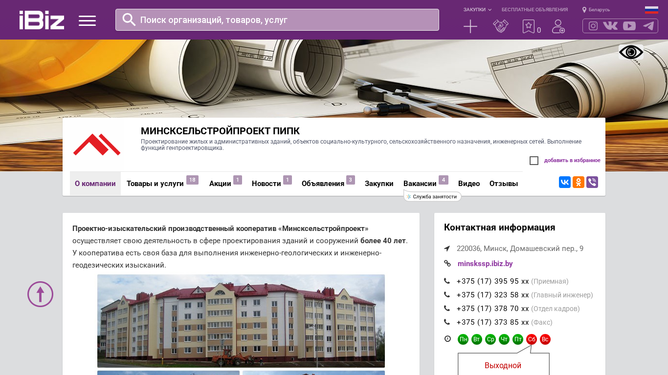 | Название / Заголовок | МИНСКСЕЛЬСТРОЙПРОЕКТ ПИПК - Проектирование жилых и административных зданий, объектов социально-культурного, сельскохозяйственного назначения, инженерных сетей. Выполнение функций генпроектировщика.. 220036, Минск, , Домашевский пер., 9 |