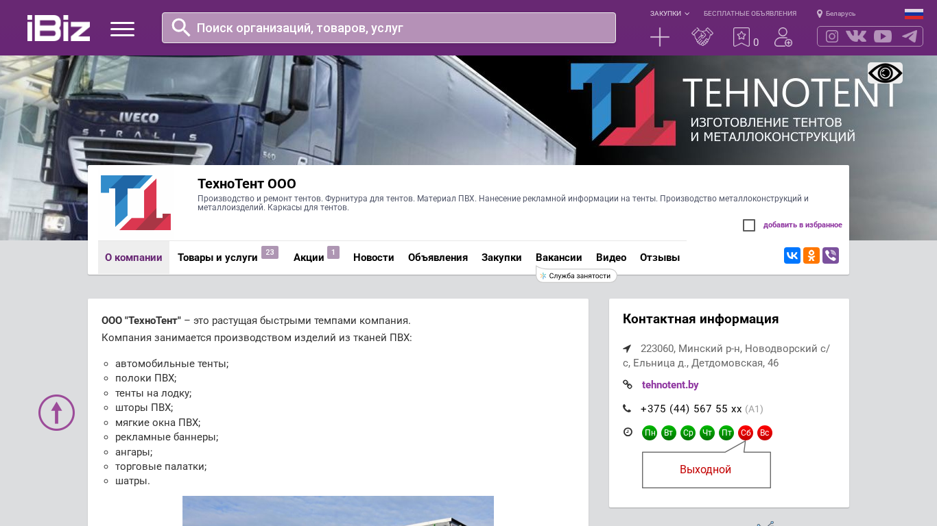 | Название / Заголовок | ТехноТент ООО - Производство и ремонт тентов. Фурнитура для тентов. Материал ПВХ. Нанесение рекламной информации на тенты. Производство металлоконструкций и металлоизделий. Каркасы для тентов. . 223060, , Новодворский с/с, Ельница д., Детдомовская, 46 |
