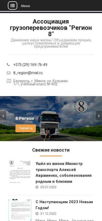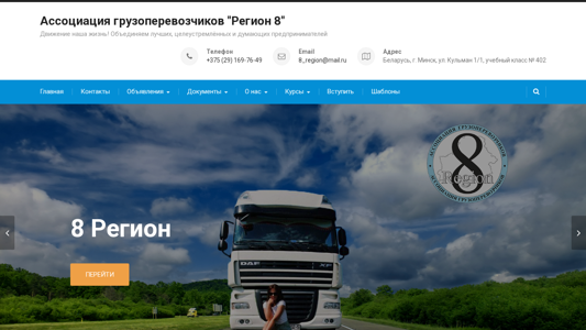 | AI-анализ | The website 8region.by is the official platform for the Association of Cargo Carriers "Region 8" in Belarus. The title of the website translates to "Association of Cargo Carriers 'Region 8' — Movement is our life! Uniting the best, goal-oriented, and thinking entrepreneurs." The description section includes information about the association, its mission, and the various services and offerings it provides to its members. Keywords associated with the website include "association," "cargo carriers," "region," and "transport." The top words used on the website are "2021," "курсы" (courses), "протоколы" (protocols), "перейти" (to pass), "наши" (our), "2022," and "наша" (our association). The website also includes sections for contacts |