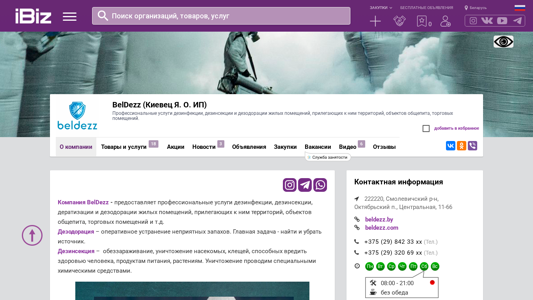 | AI-анализ | The website is for BelDezz (Киевец Я. О. ИП), a company offering professional services for decontamination, disinfection, and deodorization of residential and commercial spaces, as well as surrounding territories, public eating facilities, and retail areas. The company is located in Minsk, Belarus, at the address Центральная, 11-66, Октябрьский п. The website provides information on the company's services, which include deodorization to eliminate unpleasant odors, decontamination to kill insects and other pests harmful to human health and food products, and deratization to get rid of rodents using various methods. The company also offers de-sanitization services to eliminate disease-causing bacteria and viruses, including against COVID-19. The website includes a section for company information, |