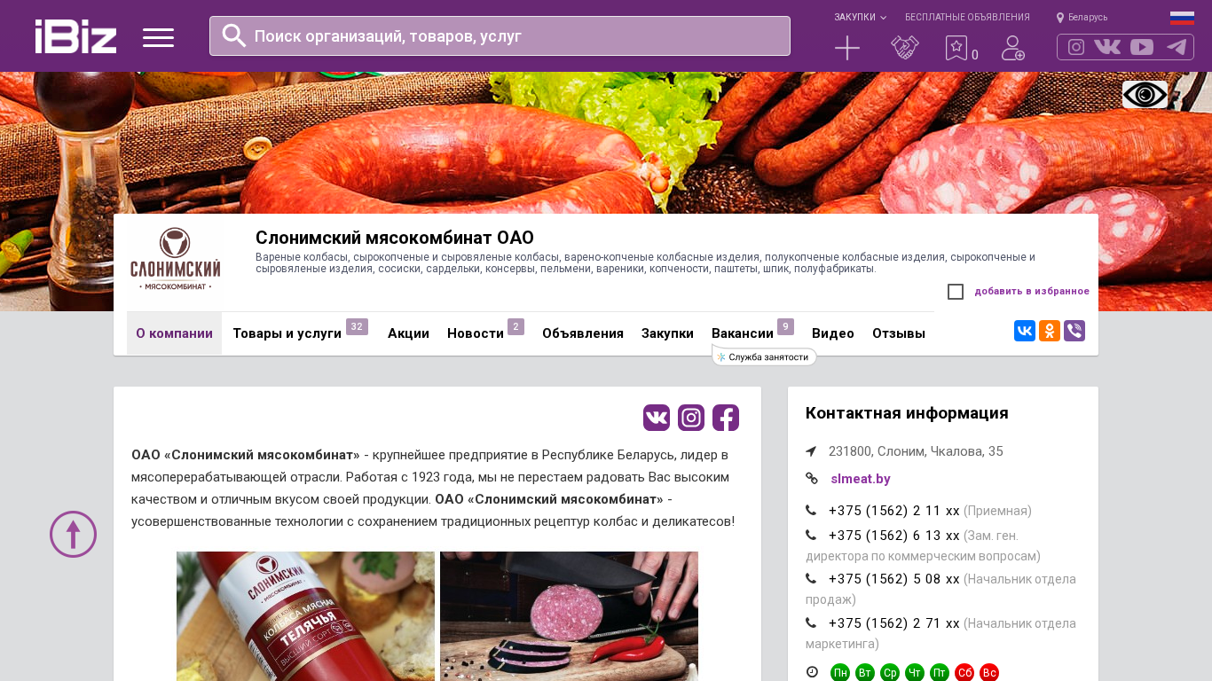 Название / ЗаголовокСлонимский мясокомбинат ОАО - Вареные колбасы, сырокопченые и сыровяленые колбасы, варено-копченые колбасные изделия, полукопченые колбасные изделия, сырокопченые и сыровяленые изделия, сосиски, сардельки, консервы, пельмени, вареники, копчености, паштеты, шпик, полуфабрикаты.. 231800, Слоним, , Чкалова, 35