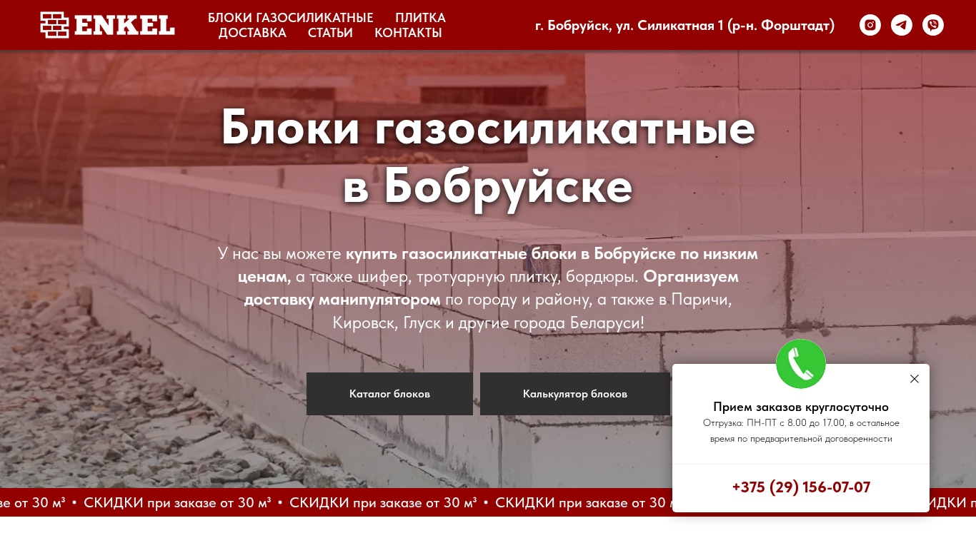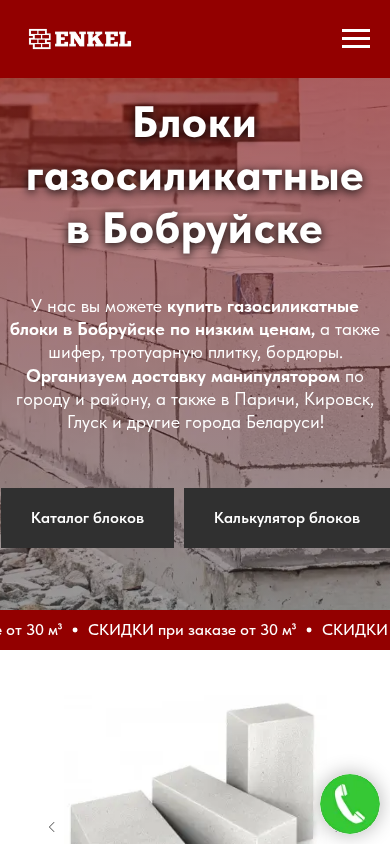 | AI-анализ | --- This online resource offers information and sales of various sizes of gas silicate blocks in Bobruisk, Belarus, for construction purposes. The website includes a calculator for estimating the number of blocks needed and mentions discounts for larger orders. The blocks come in dimensions 600x300x200, 600x300x250, and 600x300x100, among others. The company also sells other building materials such as shingles and trowel pavers, and provides delivery services in the city and nearby regions, including Parichi, Kirovsk, and Glusk. The site includes a catalog of blocks and a contact phone number for inquiries. The blocks are made by CPTP "Mogilev Gazosilikat" and are suitable for constructing external and internal walls of low- |