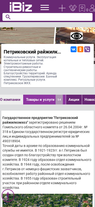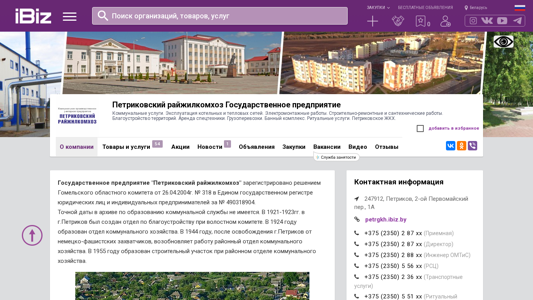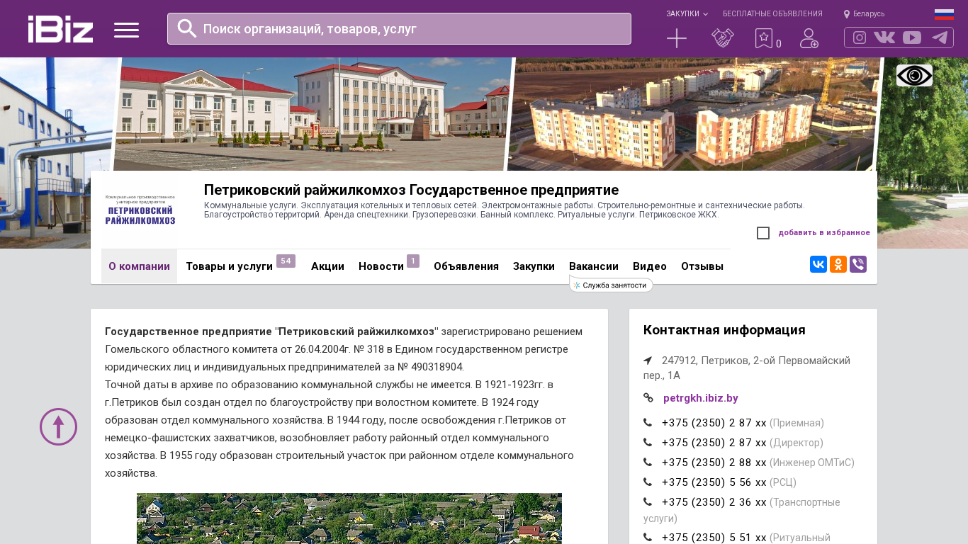 | AI-анализ | language: ru The Petrikovsky district communal housing and utilities enterprise (Petrikovskoye ZhKH) is a state-owned enterprise that provides various services, including the operation of heating and thermal networks, electrical installation work, construction and repair works, and site improvement. The company also offers equipment rental, cargo transportation, a bath complex, and ritual services. The enterprise is located in Petrikov, Belarus, at 2-oy PervoMayskiy per., 1A, and can be reached by the given contact information. The company was registered in 2004, but the exact date of the establishment of the communal services is unknown. The history of the enterprise can be traced back to 1921-1923, when an office for urban improvement was created under the local volunteer committee. In 1924, an office for commun |