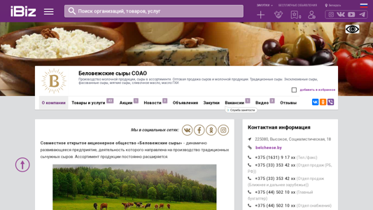 | Название / Заголовок | Беловежские сыры СОАО - Производство молочной продукции, сыры в ассортименте. Оптовая продажа сыров и молочной продукции. Традиционные сыры. Эксклюзивные сыры, фасованные сыры, мягкие сыры, сливочное масло, масло ГХИ.. 225080, Высокое, , Социалистическая, 18 |