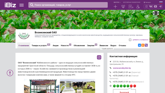 Название / Заголовок | Вознесенский ОАО - Сельскохозяйственное предприятие, специализирующееся на мясо-молочном животноводстве, выращивании сельскохозяйственных культур: зерновые, бобовые, сахарная свекла.. 225126, , Вежки д., Центральная, 25 |