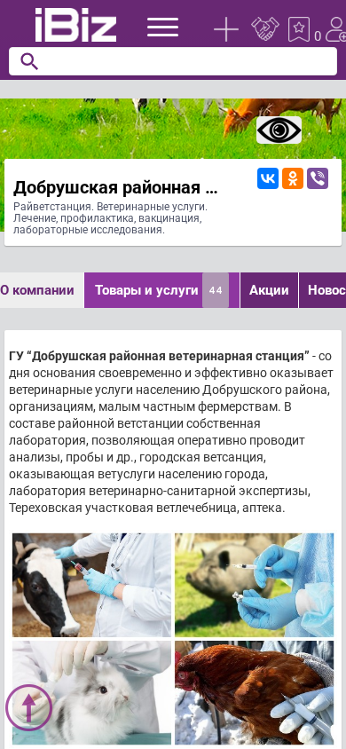 | AI-анализ | The web project "Dobrush Veterinary Station" is a Belarusian veterinary service offering veterinary treatments, prevention, vaccination, and laboratory research. The address is Добруш, Лесная, 8А. The website provides a map and contact phone numbers, and is part of the "ГУ - Райветстанция" organization. The station has its own laboratory, a city veterinary service, a veterinary-sanitary expertise laboratory, a Terekhovskaya outpatient veterinary clinic, and a pharmacy. The station conducts preventive measures, treats farm and domestic animals, performs small animal surgeries, and offers luminescent examination of small animals for mycosis. It also offers desinfestation and laboratory diagnosis of infectious and invasive diseases, as well as examination of fodder and radiological control of livestock and agricultural products. The |