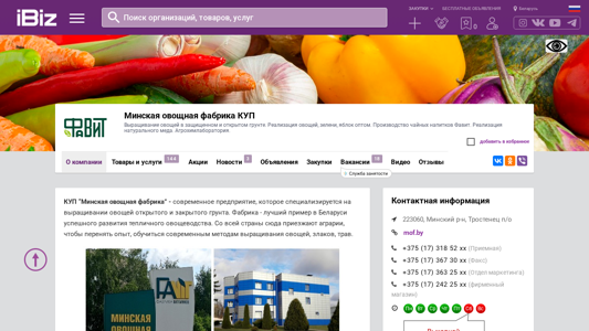 | AI-анализ | --- The web project "Minsk Vegetable Factory KUP" specializes in growing vegetables in protected and open soil. It offers the sale of vegetables, greens, and apples in bulk. The factory also produces tea beverages under the brand "Favit" and sells natural honey. An agrochemical laboratory is also part of the business. The company is located in Trostenets, Belarus. |