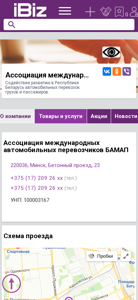The portal bamap.ibiz.by is the website of the International Automobile Transport Association BAMAP, which supports the development of automobile transportation of goods and passengers in Belarus. The site contains various sections such as 'Company', 'Goods and Services', 'News', and 'Contacts'. Users can create their own map, check traffic conditions, and add the organization to their favorites. The site also features a section for job vacancies and an option to leave feedback. The contact information for the association includes two phone numbers and the address: 220036, Minsk, Betonnyi proezd, 23. The site operates from Monday to Friday, 9:00 AM to 6:00 PM, without lunch breaks on weekdays. The domain is registered under the organization 'OOO "Aybiz Media" -Catalog of Enterprises and Organ