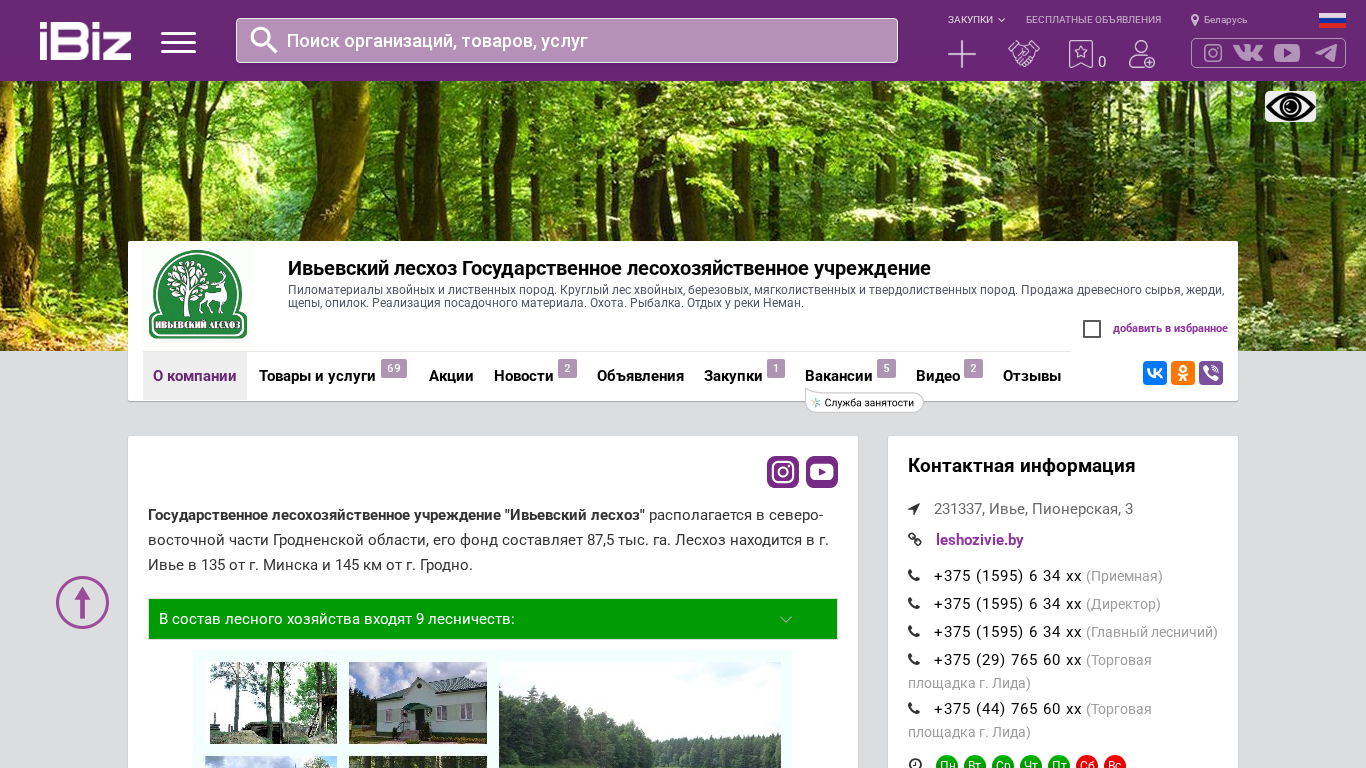 | Название / Заголовок | Ивьевский лесхоз Государственное лесохозяйственное учреждение - Пиломатериалы хвойных и лиственных пород. Круглый лес хвойных, березовых, мягколиственных и твердолиственных пород. Продажа древесного сырья, жерди, щепы, опилок. Реализация посадочного материала. Охота. Рыбалка. Отдых у реки Неман.. 231337, Ивье, , Пионерская, 3 |
