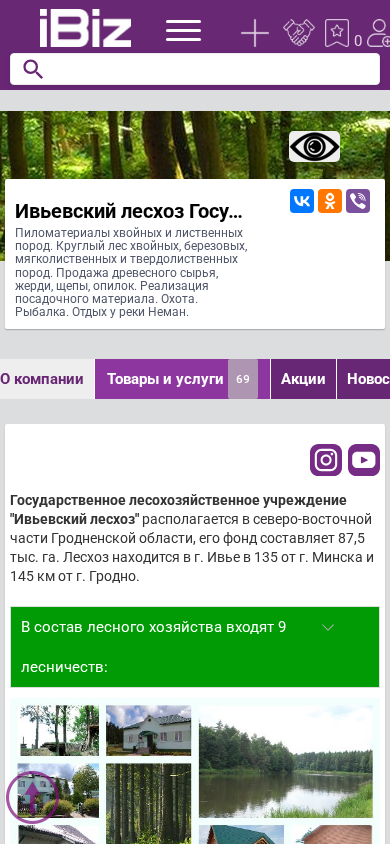| AI-анализ | The portal is a state forestry enterprise named "Ивьевский лесхоз" in Belarus, specializing in the sale of round timber and wood products of coniferous, birch, deciduous and hardwood trees. The offerings include the sale of raw timber, poles, chips, and sawn timber, as well as the distribution of planting materials. Additional activities include hunting, fishing, and recreation along the Neman River. The enterprise is located in the town of Ивье, Grodno region, 135 km from Minsk and 145 km from Grodno. It consists of nine forestry districts: Bakshтанское лесничество, Iv'evское лесничество, Lezhnevičskoe lesničestvo, Lejukinskoe lesničestvo, Lepe |