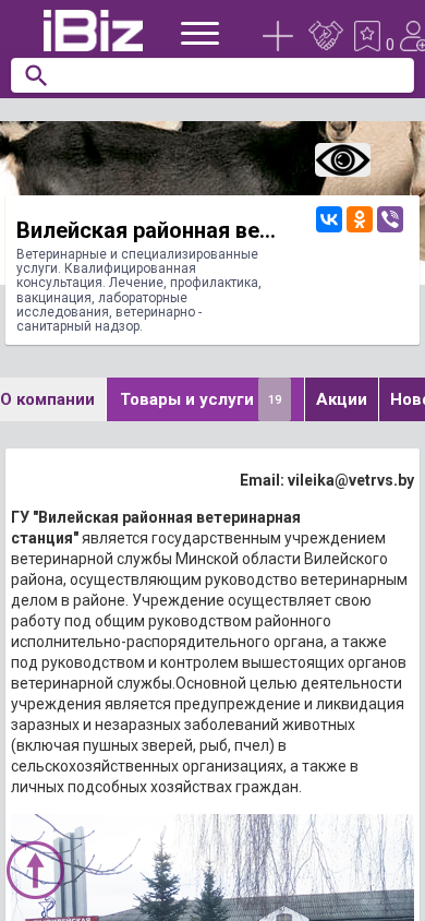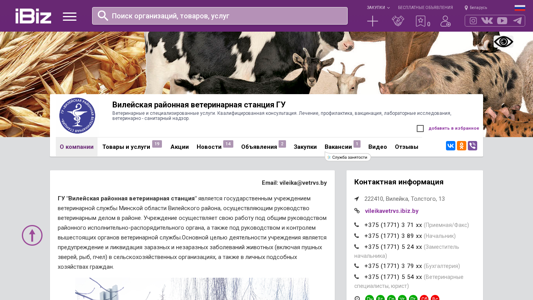 | AI-анализ | The website is for "Вилейская районная ветеринарная станция ГУ" (Vileika Regional Veterinary Station), a state-owned veterinary service in the Belarusian district of Vileyka. The station specializes in providing veterinary and specialized services, including consultation, treatment, prevention, vaccination, laboratory investigations, and veterinary-sanitary oversight. The station's main goal is to prevent and eliminate infectious and non-infectious diseases in livestock and private farms for citizens. The website includes sections for company information, products and services, news, job vacancies, and contact details, including an email address (vileika@vetrvs.by). |