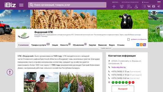 | AI-анализ | The web project "Fedorsky SPC" specializes in cattle breeding. This includes raising and fattening young cattle, breeding high-quality dairy cattle, and agriculture and grain production. The farm grows various crops including wheat, legumes, corn, and oats. The address of the company is 225524, , Fedory ag., Centralna, 18. The project is named 'Fedorsky SPC'. The main focus of the business is livestock farming and dairy production, but they also engage in crop farming and grain production. The farm has a modern infrastructure and machinery, with four dairy farms, three farms, and a complex for raising and fattening young cattle. The farm's partners include SA Savushkin Product, Pinsk Meat Combine, and Berezovsky Meat Canning Combine. The farm is constantly ev |