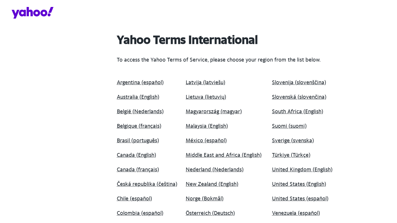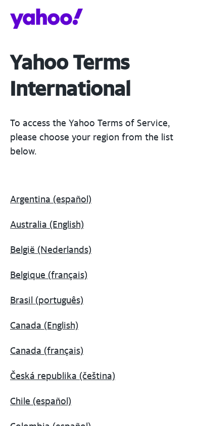 | AI-анализ | The web project "Yahoo Terms International | Yahoo" is a legal website that offers access to the Yahoo Terms of Service in various languages. Users can choose their preferred language from a list that includes Argentine Spanish, Australian English, Belgian Dutch and French, Brazilian Portuguese, Canadian English and French, Czech, Chilean Spanish, Colombian Spanish, Danish, German, Estonian, Spanish, Spanish, United States Spanish, French, Croatian, Indian English, Indonesian English, Irish English, Italian, Latvian, Lithuanian, Hungarian, Malaysian English, Mexican Spanish, Middle Eastern and African English, Dutch, New Zealand English, Norwegian, Austrian German, Peruvian Spanish, Philippine English, Polish, Portuguese, Quebec French, Romanian, Swiss German and French, Swiss Italian, Singapore English, Japanese, Slovenian, Slovak, South African English, Finnish, |