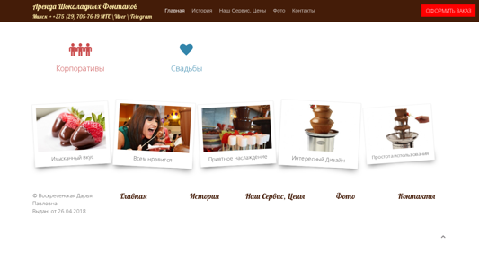 | AI-анализ | The web project "Шоколадный фонтан, аренда шоколадного фонтана в Минске" (ChocoFontan.by) offers the rental of chocolate fountains in Minsk at an affordable price. Visitors can place an order by calling 8-033-637-98-89 or through the website. The website contains information about the company's history, services, prices, photos, and contacts. The main sections include "История" (History), "Наш Сервис, Цены Фото" (Our Service, Prices, Photos), "Контакты" (Contacts), and "Аренда, Установка, Оформить заказ" (Rent, Installation, Place an Order). The website also provides options for corporate events, weddings, parties, |