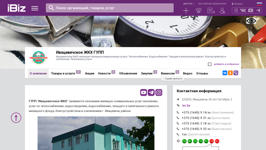 | AI-анализ | The web project "Ивацевичское ЖКХ ГУПП" (ivc.ibiz.by) is a municipal utility company based in Ivacevichi, Belarus, offering a range of residential and communal services. These include heating, water supply, current and capital repairs, landscaping and gardening, and funeral services. The company also provides various products and services, such as windows and doors made of PVC profile, and the installation of water and sewage pipes and repairs to plumbing and engineering networks. The utility company operates several branches, including heating plants, a water and sewage treatment facility, a production laboratory, and a guest house. It also has a canteen and a banquet hall, and offers rental accommodation. The company's website provides contact information and details on its various services and offerings. |