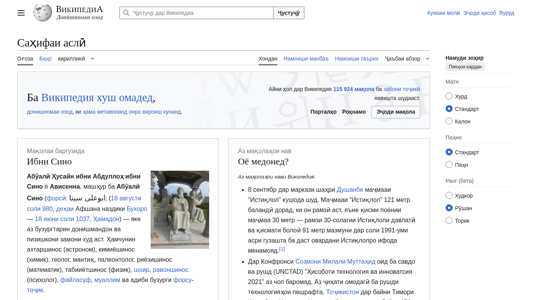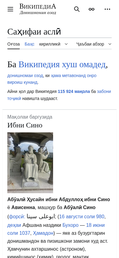 This website is the Tajik-language Wikipedia, a free online encyclopedia that provides information on various topics in the Tajik language. It contains over 115,924 articles, making it a comprehensive source of knowledge accessible to users in the Tajik community. The website's title translates to "Vikipedia - the free encyclopedia" in Tajik. Notable figures such as Avicenna, a polymath and philosopher, are featured on the site. The content is available in the standard format and can be easily accessed and read on any browser window. The site offers various features including a search function, different language versions, and the ability to print or export articles as PDFs. The content is contributed by a large community of volunteers, ensuring a wide range of information is available.