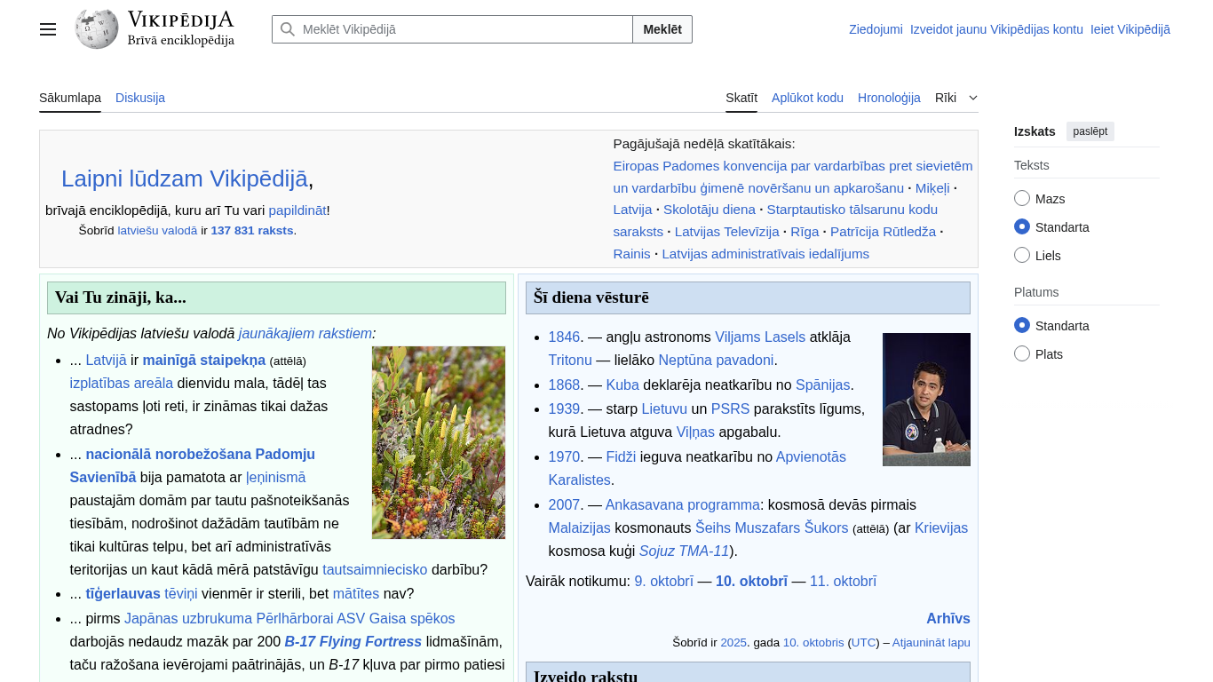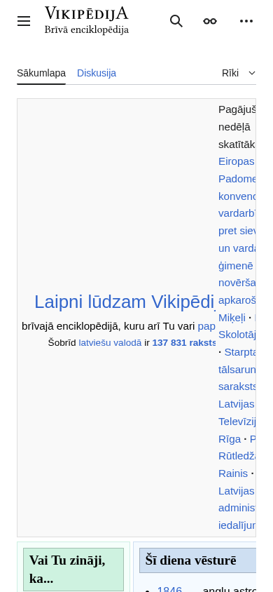 | AI-анализ | This website is the Latvian version of Wikipedia, a free encyclopedia where anyone can edit. With over 137,800 articles, it covers a wide range of topics in the Latvian language. Recent popular articles include the European Convention on Human Rights and Fundamental Freedoms amendment and renovation, Latvia's School Day, the International Telecommunication Union country code list, and Riga, the capital city of Latvia. The content adjusts to fit the size of your browser window. Wikipedias Latvian section has a small font size to fit more on the page, as space is limited in this area. Other projects related to Wikimedia Foundation, MediaWiki, Meta-Wiki, Wikimedia Outreach, Multilingual Wikisource, Wikispecies, Wikigrants, Wikidati, Wikifunctions, Wiktionary |