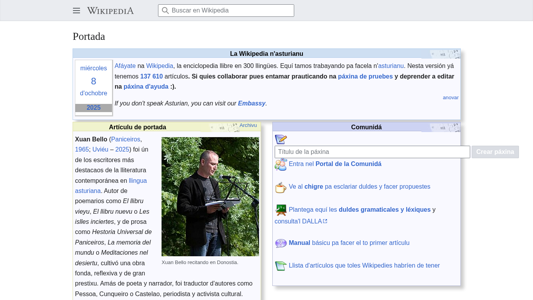 | AI-анализ | The web project is an Asturian-language version of Wikipedia, a free online encyclopedia available in over 300 languages. The website contains 137,610 articles, and includes sections on art, literature, history, science, and culture. Users can donate to support the project. The homepage features a notice about illegal activity and a link to the main page in Asturian, which displays a random article and invites visitors to edit and contribute. A notable figure from Asturian literature, Xuan Bello, is featured on the homepage, along with information about the history of October 8th and notable birthdays, including those of Edu Manga, a Brazilian football player, and Jane Goodall, a British primatologist and ethologist. |