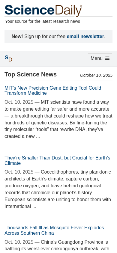 | AI-анализ | The portal ScienceDaily is a source for the latest research news, providing articles on a wide range of topics including agriculture, animals, anthropology, astronomy, bacteria, biology, botany, brain, breakthroughs, cancer, cell, chemistry, climate, climate change, computer science, computers, daily, dinosaurs, discover, discoveries, discovery, diseases, earth, energy, engineering, environment, environmental science, findings, fossils, genetics, geography, geology, global warming, health, heart disease, journal, magazine, mammals, math, mathematics, matter, medical, medicine, nanotechnology, neuroscience, new species, news, nuclear, nucleus, peer review, physics, planet, plants, pollution, psychology, research, researcher, robotics, robots, science, science daily, scientific, scientist, solar, space, stars, stem cells, technology |