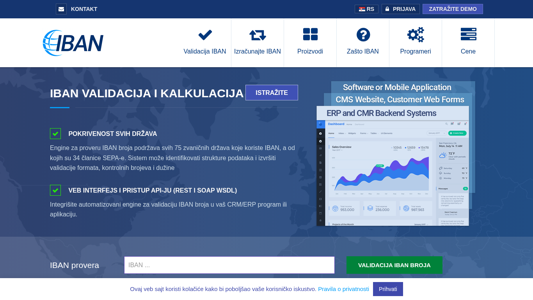 This online resource, IBAN.rs, offers a program called IBAN provera for validating International Bank Account Numbers (IBAN) and identifying the bank that owns the account, Bank Identifier Code (BIC), and address. The website uses standard mathematical algorithms to ensure the integrity of the IBAN number. IBAN provera supports validation of IBAN data from all 75 countries that officially use IBAN, of which 34 are members of the Single Euro Payment Area (SEPA). The system can identify data structures and perform format, checksum, and length validations. Users can integrate the automated IBAN validation engine into their CRM/ERP programs or applications. IBAN provera offers two packages: a validation and calculation package and a BIC validation service dedicated to web-based BIC validation. The Banking Package validates bank accounts and bank