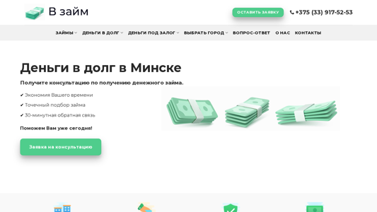 | SEO-описание | Нужны деньги в долг в Минске? Наш сервис по поиску займов поможет найти оптимальные условия. Без залога и поручителей, срочно. Получите до 17000 BYN за 30 минут. Заполните заявку на сайте уже сегодня! |