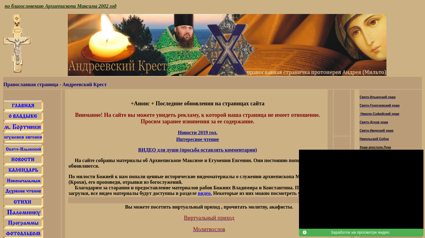 | AI-анализ | language: ru  This website is a Russian-language Orthodox Christian page dedicated to Father Andrey (Miltio) and his Andreevsky Cross. The site, which has been blessed by Archbishop Maxim in 2002, features news, information about various churches in Bobruisk, and spiritual readings. Visitors can find announcements, the latest updates, and a section for videos, including historical footage of Archbishop Maxim's services and sermons. The site also includes a virtual church where visitors can access prayers, hymns, and information about various rituals and services. Users can leave requests for prayers in the guestbook and view a schedule of services in local churches. The site contains advertisements unrelated to its content, and visitors can access a virtual parish, where they can read prayers, hymns, and find information about various rituals and services. The site |
