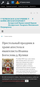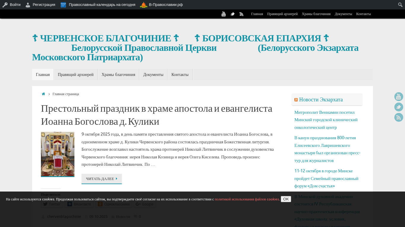 | AI-анализ | This online resource is dedicated to the Chervenskoe Blagochinie Borisovskaya Eparchy of the Belarusian Orthodox Church (Belarusian Exarchate of the Moscow Patriarchate). The website provides information on the ruling archpriest, churches, documents, and contacts of the eparchy. The main content includes news and announcements of religious events and activities, such as a liturgy dedicated to the feast day of St. John the Evangelist at the Church of St. John the Baptist in the village of Kuliki on October 9, 2025. Other articles cover topics like classes for adults at the church in Smilavichi and a discussion on how to resist temptations with Father Gedeon, a monk and the priest of the Church of St. Nicholas the Wonderworker. The website also includes links to social media platforms like Twitter |