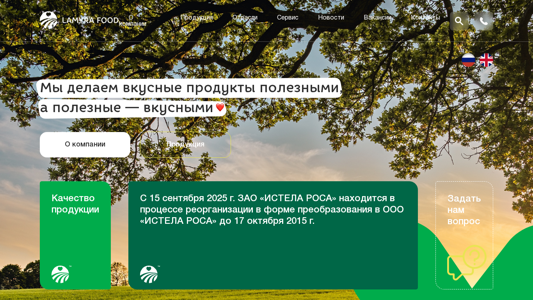 The website <lamyrafood.by> is dedicated to Lamyra Food, a Belarusian company specializing in the production and development of stabilizers, feed additives for the agricultural sector, and natural colors and food products for the food industry. The website offers information about the company, its products, and services, as well as news, vacancies, and contacts. Lamyra Food aims to make healthy and tasty food products, while also making healthy options more appealing. The website provides a link to download a PDF presentation for more information. The company is currently undergoing reorganization from ZAO "Istela Rosa" to OOO "Istela Rosa" until October 17, 2015.