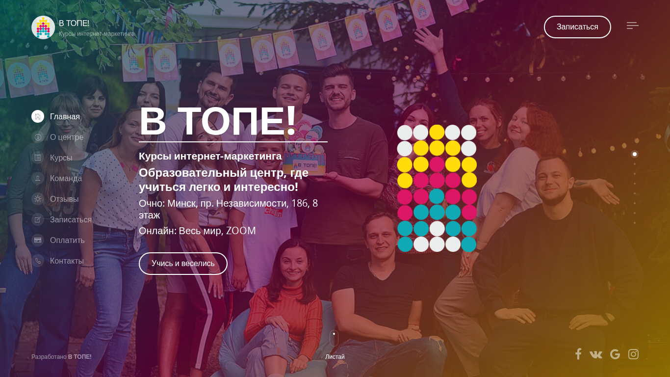 | AI-анализ | The website is an educational center called 'В ТОПЕ!' based in Minsk, Belarus. It offers courses in internet marketing, including SEO, SMM, contextual advertising, IT courses for children, and English language courses. Users can sign up on the site. The center also has a team, positive reviews, and various contact options. The courses are available both in-person at an address on Nezavisimosti Prospect, and online via ZOOM. The mission of 'В ТОПЕ!' is to make the world more interesting and successful by teaching anyone the basics of IT technologies and helping them change their lives. The center aims to make learning enjoyable and offers various course packages. The SEO courses aim to increase income. The English language courses last for 4.5 months, with various pricing options for group, individual, and pair classes. The center also offers a Friday! Party & |