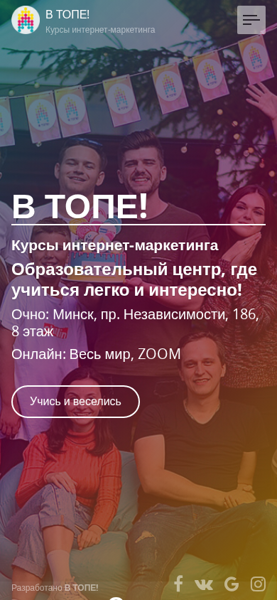 | SEO-описание | Образовательный центр В ТОПЕ в Минске, Беларусь - это обучение и отдых одновременно. ✔ Это курсы по интернет-маркетингу нового поколения: SEO, SMM, Контекстная реклама, IT-курсы для детей, Курсы английского! ☎ Запишись на сайте! |