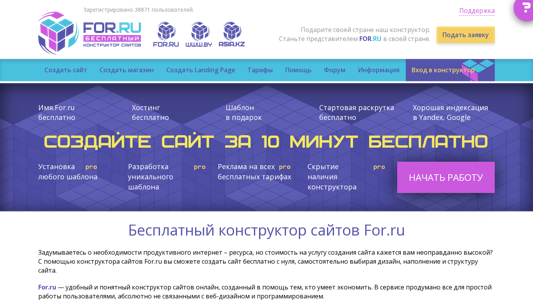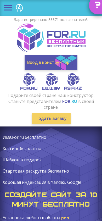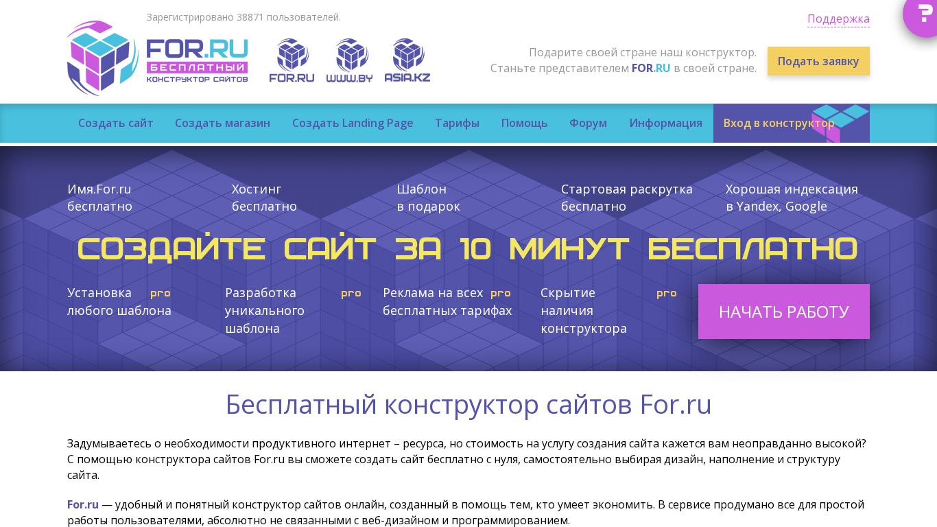 | AI-анализ | language: ru The portal For.ru is a free website constructor offering services for creating websites of various themes, ranging from a simple website to an internet store, without the need for programming knowledge. Keywords associated with the site include 'free website constructor', 'create website for free', 'free website', 'create website', and 'internet store constructor'. The service's support team can only be contacted through a form, with the exception of cases where submitting a request through the form is not possible. For partnership inquiries or payment issues related to Asia.kz or For.ru, contact webpage.by@yandex.ru. The platform also has a forum and social media groups for user queries. Over 38,000 users have registered, and the constructor allows users to create a site, a shop, or a landing page. The site offers various tariffs for companies and internet stores, |