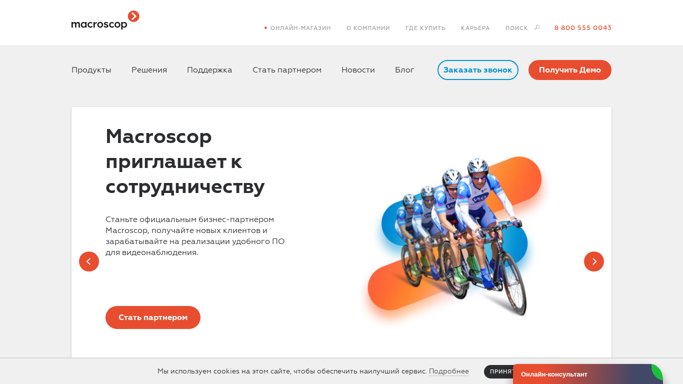 | AI-анализ | language: ru This website is for Macroscop, a professional software for IP cameras. The title of the website is 'Macroscop - профессиональное ПО для IP-камер' and it offers a demo version and an online shop for purchasing the software. The description mentions various features of the software including video analysis, object detection, people counting, and temperature mapping. Keywords associated with the website include 'Macroscop', 'детектор', 'камер', 'поддержка', 'учреждения', 'видеонаблюдения', 'калькулятор', 'подсчет', 'обнаружение', 'версию', '2025', 'nvr', 'государственные', 'вашу', 'компании', 'контроль', and 'партнеров'. The website also |