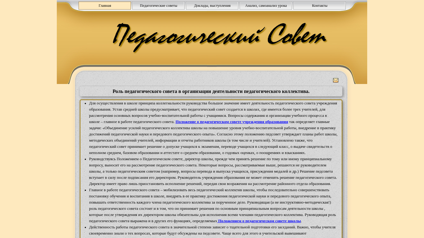 | Название / Заголовок | Роль педагогического совета в жизни школы. - Педагогический совет. Педсовет. |