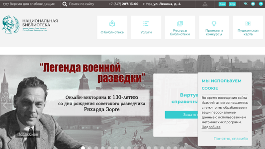 --- The website is for the National Library of the Republic of Bashkortostan named after Ahet-Zaki Validi. It provides information about the library, including services, resources, and collections. Keywords associated with the site include 'national library', 'Ufa library', 'electronic catalog', 'children's center', 'youth center', and 'periodicals'. The library offers various services such as book lending, ordering, and electronic document delivery. It also features an electronic catalog, a children's center, a youth center, and a periodicals section. The site includes resources for professionals, projects, and contests, as well as an audiobook section and a section for local history research. The library's contact information is provided, including a phone number and address in Ufa. The website is available in both a standard and accessible version.