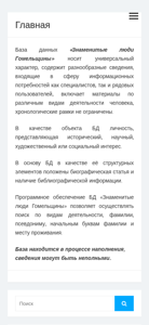 | AI-анализ | The website "Знаменитые люди Гомельщины" (Personalities of Gomel Oblast) is a universal database containing various types of information, appealing to both specialists and regular users. The subject matter covers different aspects of human activity and is not limited to specific time frames. The database focuses on personalities of historical, scientific, artistic, or social significance, with a biographical article and bibliographic information as its fundamental elements. The database software allows searching by type of activity, family name, pseudonym, initial letters of family name, and place of residence. The database is a work in progress, and the information may not be complete. It includes an alphabetical index and categories for various types of activities. The website domain is person.goub.by. |