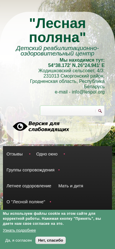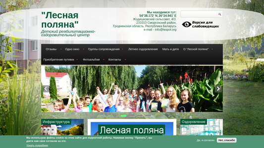| AI-анализ | The portal "Лесная поляна" is a children's rehabilitation and health resort located in Smorgońsky district, Grodnen oblast, Belarus. The website provides information for visitors about the sanatorium, including its coordinates (54°38.172' N, 26°24.941' E), address (4/3, Joдишkovsky сельсовет, 231013), and contact email (info@lespol.org). The website features sections on the daily regime, nutrition for parents and children, life in the center, education, rest, excursions, rules and traditions, useful tips for parents and children, pedagogical staff, documentation, organization of educational process, and practical information. It also offers medical services, with various medical profiles and procedures, as well as prices for these services |