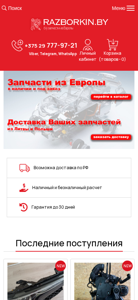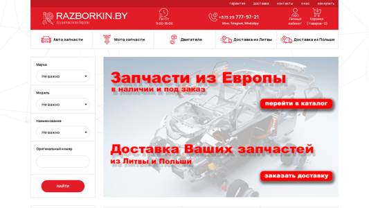 | AI-анализ | This website, titled "Разборкин" in Russian, offers used auto parts from Europe for sale. The description mentions that parts are available for any car brand and includes options to purchase used engines with guarantees. Customers can contact the seller by phone at +375 29 777-97-21 for consultation and inquiries. The website also features sections for auto and motor parts, deliveries from Litvia and Poland, and a guarantee. Customers can place orders from Monday to Friday, 9:00-18:00. The website lists various parts in stock, including those for Alfa Romeo, Volkswagen, Fiat, and Hyundai, with details on availability, article numbers, and conditions. The website also mentions delivery options within Belarus and the possibility of delivery to Russia, as well as various payment methods and a |