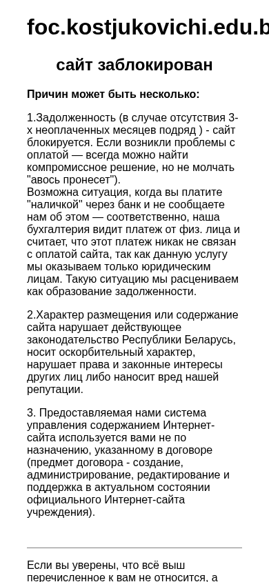 | AI-анализ | The web project "Site blocked" (foc.kostjukovichi.edu.by) is a blocked educational website. Reasons for blocking may include: 1) unpaid bills (for three consecutive months) leading to site blockage. If payment issues arise, a compromise solution is always possible. However, failure to communicate may result in the site being marked as overdue. In some cases, payments made directly to the bank without notification to our accounting department may be perceived as unrelated to the website payment, resulting in an overdue status. 2) The website's content or placement violates the current legislation of the Republic of Belarus, contains offensive material, infringes upon others' rights or harms our reputation. 3) Our content management system is being used inappropriately, contrary to the contract terms (the subject of the contract is the creation, administration, editing, and maintenance of |