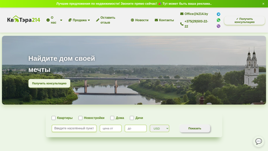 | AI-анализ | This online resource is an estate agency website, titled "Агентство недвижимости" (Real Estate Agency), with a focus on the Belarusian cities of Posolavlje (Полоцк) and Novopolotsk (Новополоцк). The website provides listings for various types of properties, including houses, apartments, and commercial spaces, for sale and rent. Prices for these properties are displayed in both Belarusian BYN and US dollars. Some popular listings include a house in Posolavlje for BYN 120,108 and a house in Novopolotsk for BYN 675,607.50, both with corresponding USD values. The website also includes contact information for the agency, allowing users to request consultations. Keywords associated with the website include "price," "USD," |