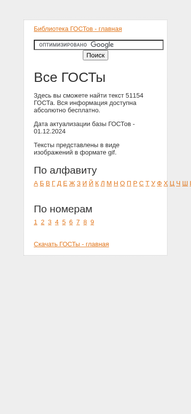 | AI-анализ | language: ru --- This website, titled "Все ГОСТы" (All GOSTs), is a free library of all GOST documents (51154). The description indicates that all information is accessible without charge and that the database of GOSTs is updated on December 1, 2024. The texts are presented as images in the gif format, and users can search for documents by alphabetical order or by number. The domain is vsegost.com and the language is Russian. |