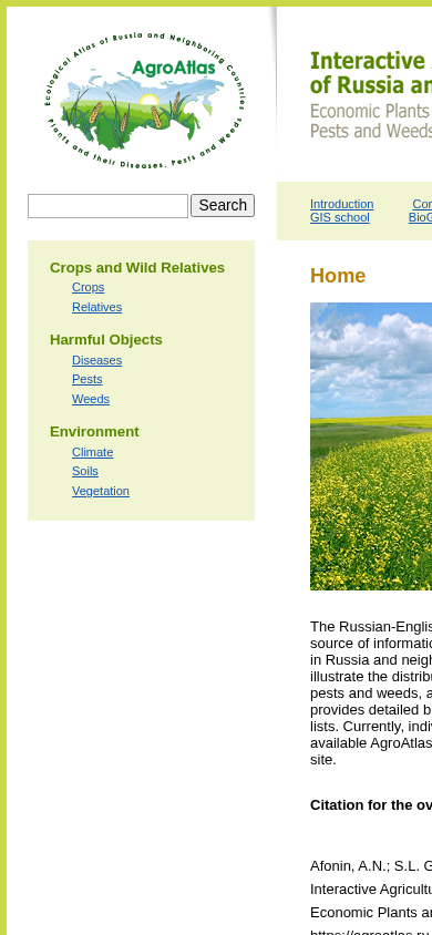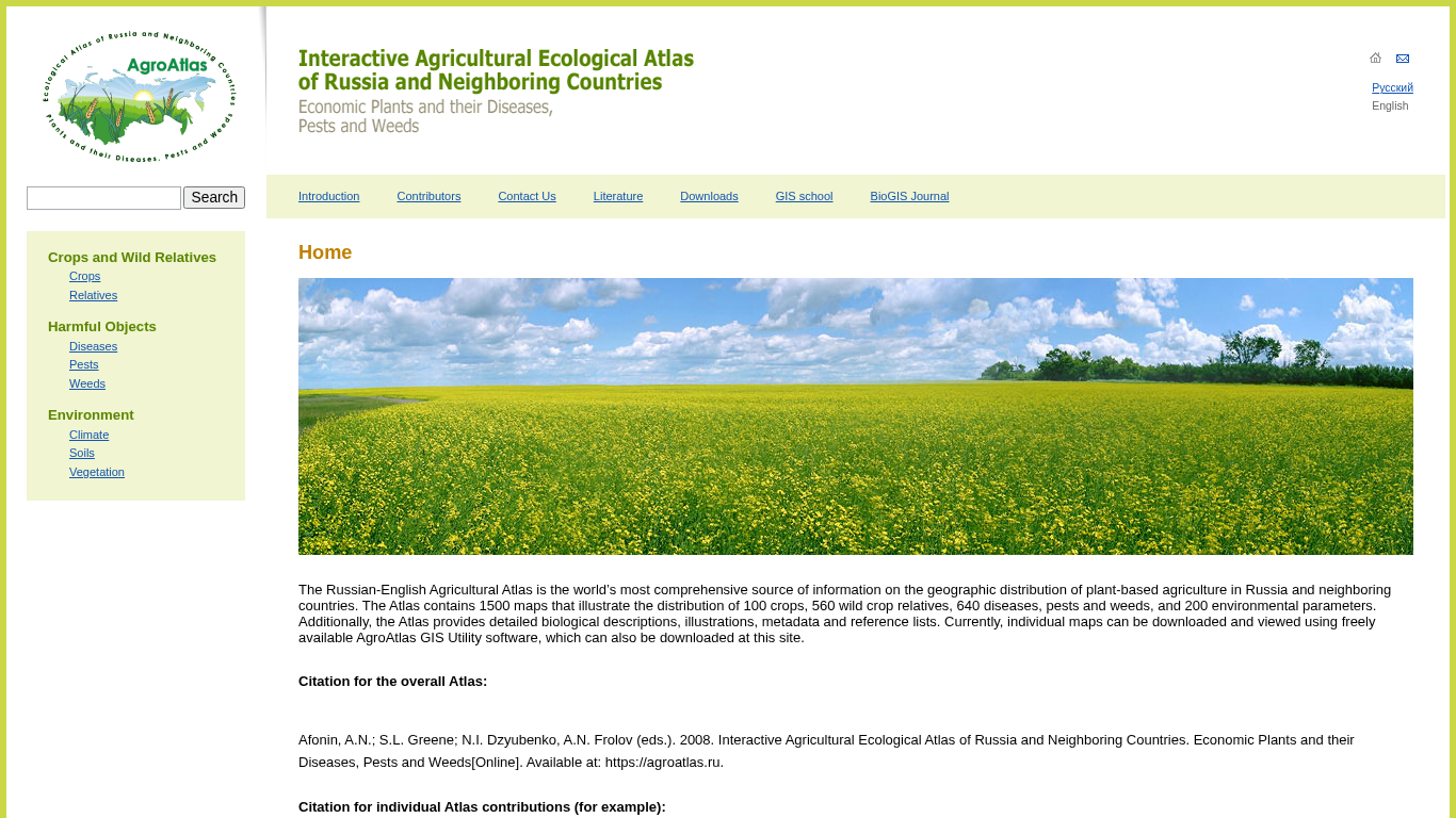 | AI-анализ | The website AgroAtlas is an interactive agricultural atlas providing comprehensive information on the geographic distribution of plant-based agriculture in Russia and neighboring countries. It contains 1500 maps illustrating the distribution of 100 crops, 560 wild crop relatives, 640 diseases, pests, and weeds, and 200 environmental parameters. The website offers detailed biological descriptions, illustrations, metadata, and reference lists, and individual maps can be downloaded and viewed using freely available AgroAtlas GIS Utility software. The Atlas is available online at <https://agroatlas.ru>. Citations for individual Atlas contributions and AgroAtlas GIS Software can also be found on the website. |